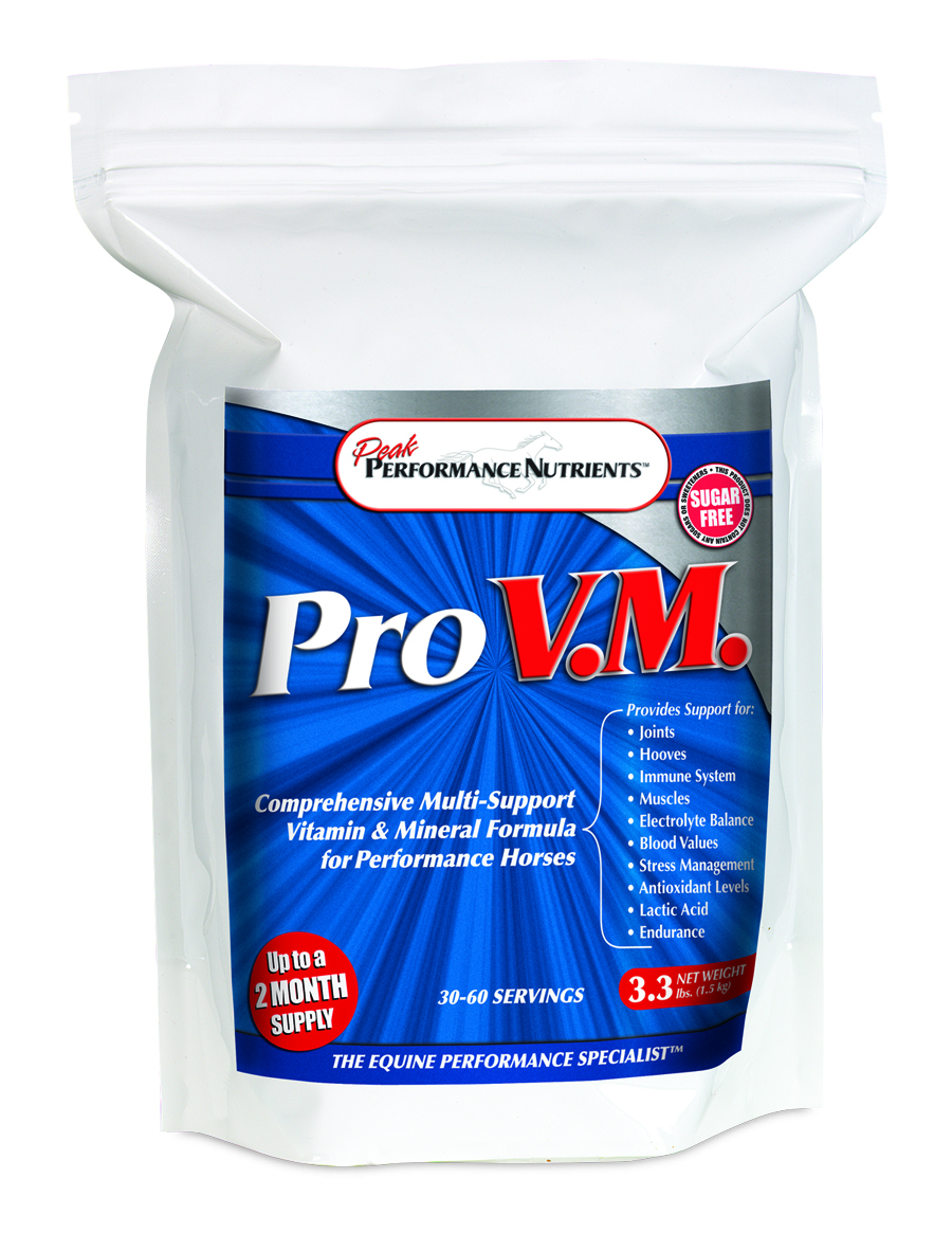 PRO V.M. esta formulado específicamente para caballos de carreras, al incluir la mayor cantidad dietética recomendad de cada nutriente, nutrientes que se agotan con el ejercicio intenso.